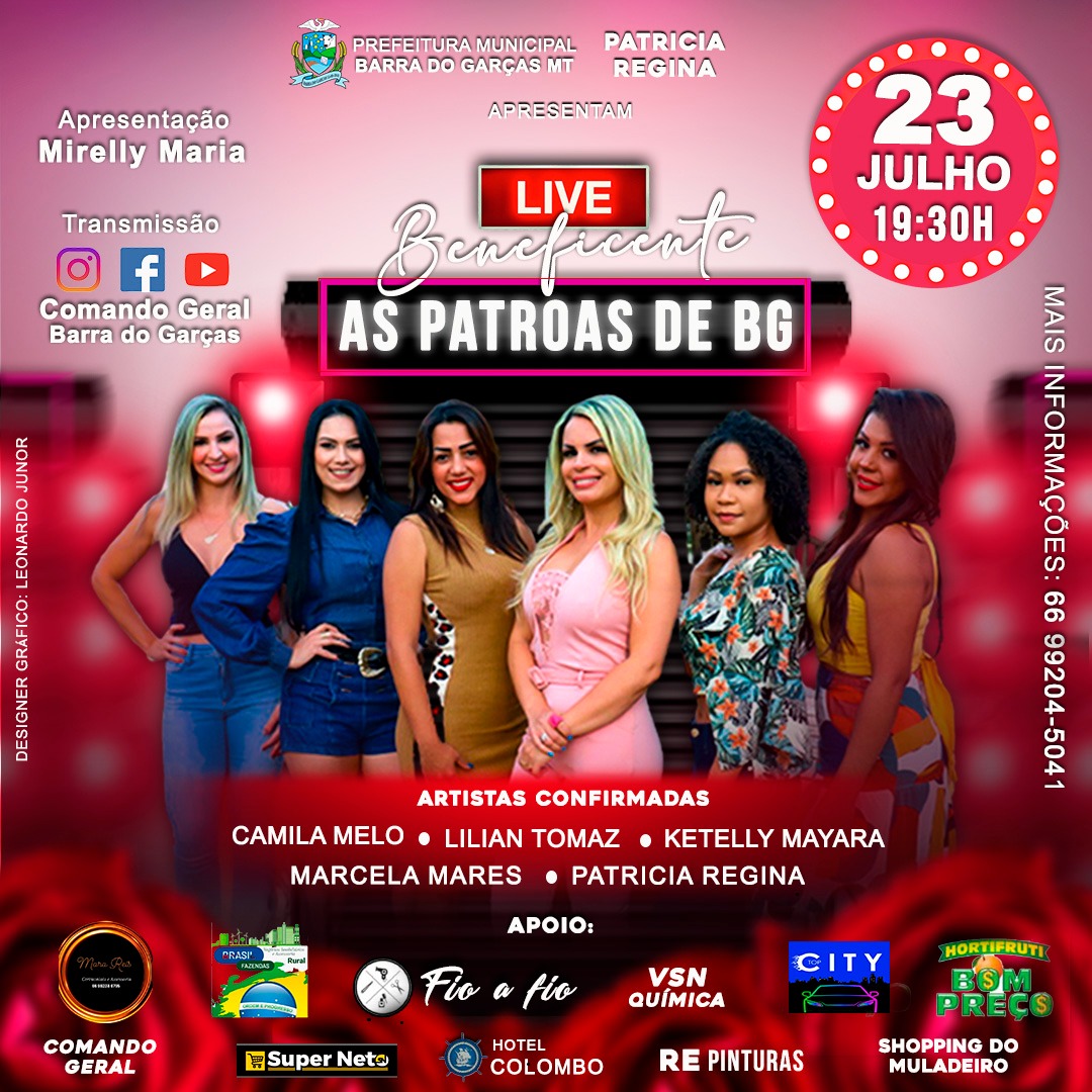 A live contará com a presença das Patroas de BG, mulheres cantando, Marcela Mares, Patrícia Regina, Camila Melo, Lilian Tomaz e Ketely Mayara, além da participação de Ricardinho, Léo Marques, Guga e Romário. A transmissão será nas redes sociais do Comando Geral, no Instagram e Facebook, e pelo canal do Youtube.