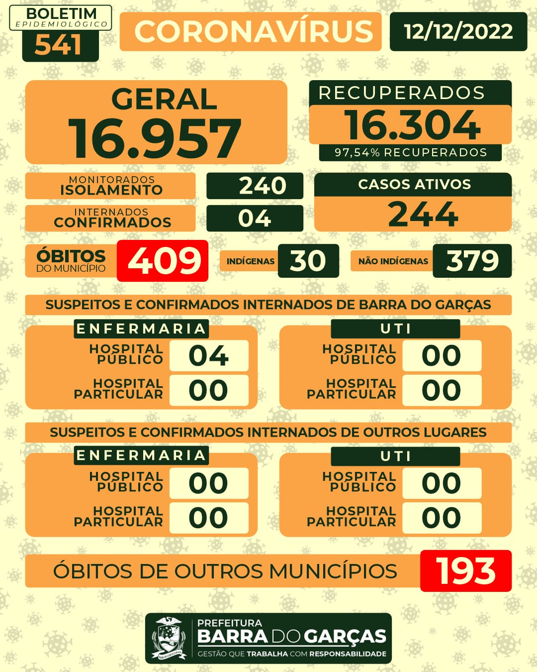 Desde o início da pandemia em 2019, Barra do Garças teve 16.957 pessoas contaminadas, destas 16,304 se recuperaram e 409 faleceram pelas complicações da doença. Das 244 pessoas que estão contaminadas, 240 recuperam em casa em isolamento, enquanto 4 estão internadas na enfermaria do Hospital Público.